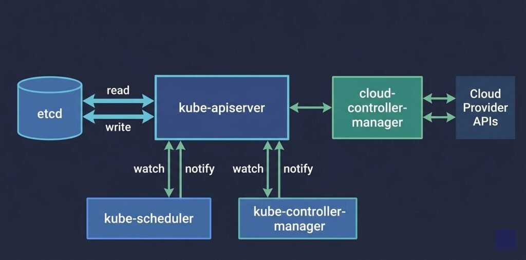 DIAGRAM: Control plane internals — API Server in the center connected to etcd on one side (read/write arrows), connected to Scheduler and Controller Manager below (watch/notify arrows), connected to Worker Nodes on the right (kubelet heartbeat arrows). Cloud Controller Manager shown separately connecting to Cloud Provider APIs.