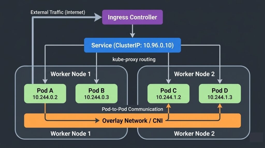 DIAGRAM: Kubernetes cluster networking overview — show two worker nodes. On each node show two pods with their own IPs (e.g. 10.244.0.x and 10.244.1.x). Show pod-to-pod communication across nodes via an overlay network or direct routing. Show a Service ClusterIP pointing to pod endpoints via kube-proxy. Show an Ingress at the top routing external traffic to the Service.
