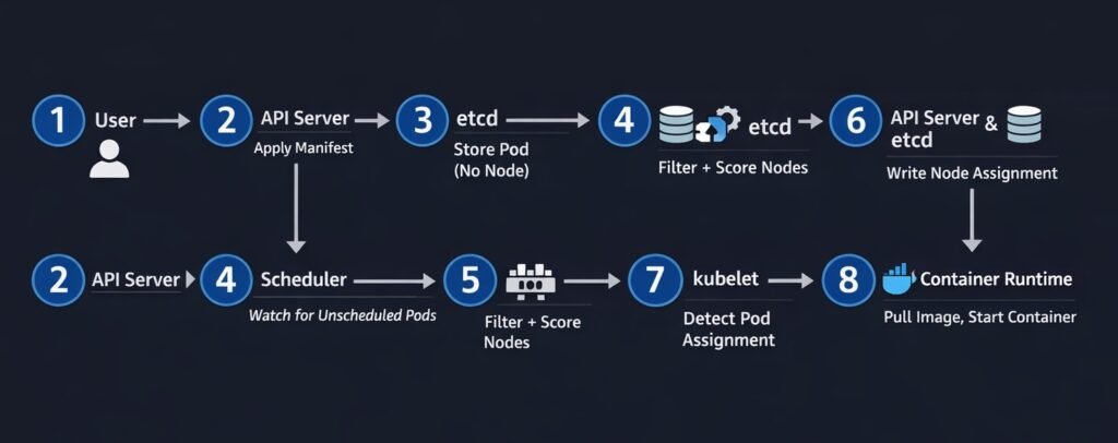 DIAGRAM: Pod scheduling flow — step by step numbered sequence: 1) User applies Deployment manifest to API Server, 2) API Server stores pod spec in etcd with nodeName empty, 3) Scheduler watches API Server and detects unscheduled pod, 4) Scheduler runs filter+score algorithm, 5) Scheduler writes selected node name to etcd via API Server, 6) kubelet on selected node detects pod assignment, 7) kubelet pulls image and starts container, 8) kubelet reports Running status back to API Server.