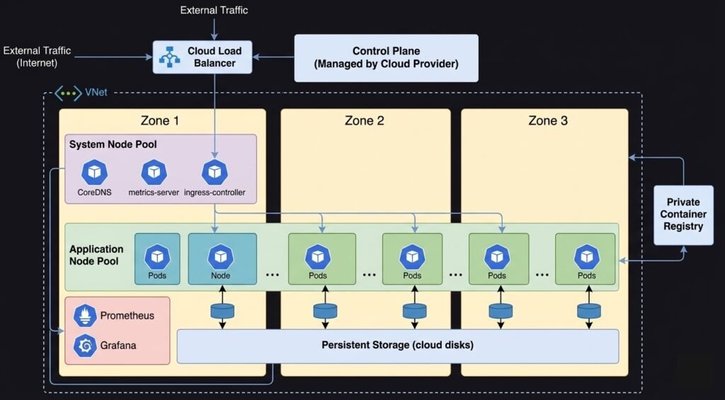 DIAGRAM: Production AKS/EKS/GKE reference architecture — show multiple availability zones. Control plane in a managed zone (cloud provider managed). System node pool in zone 1 with system pods (CoreDNS, metrics-server, ingress controller). Application node pool spread across zone 1, 2, 3 with application pods. Azure Load Balancer or cloud LB in front. Private container registry. Persistent storage (Azure Disk/EBS/PD). Monitoring stack (Prometheus/Grafana). VNet/VPC boundary around the whole cluster.