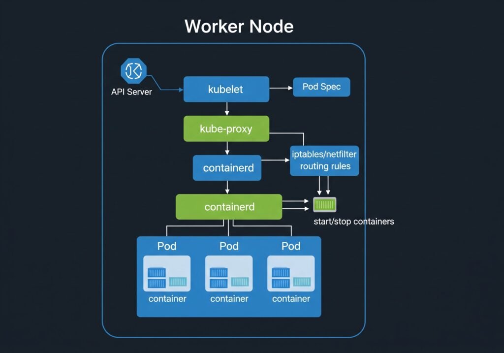 DIAGRAM: Single worker node internals — outer box labeled ‘Worker Node’. Inside: kubelet (top), kube-proxy (middle), containerd/container runtime (bottom). Below container runtime, show 3 Pod boxes, each containing containers. Arrows showing: API Server → kubelet (pod spec), kubelet → container runtime (start/stop containers), kube-proxy → iptables/kernel (routing rules).