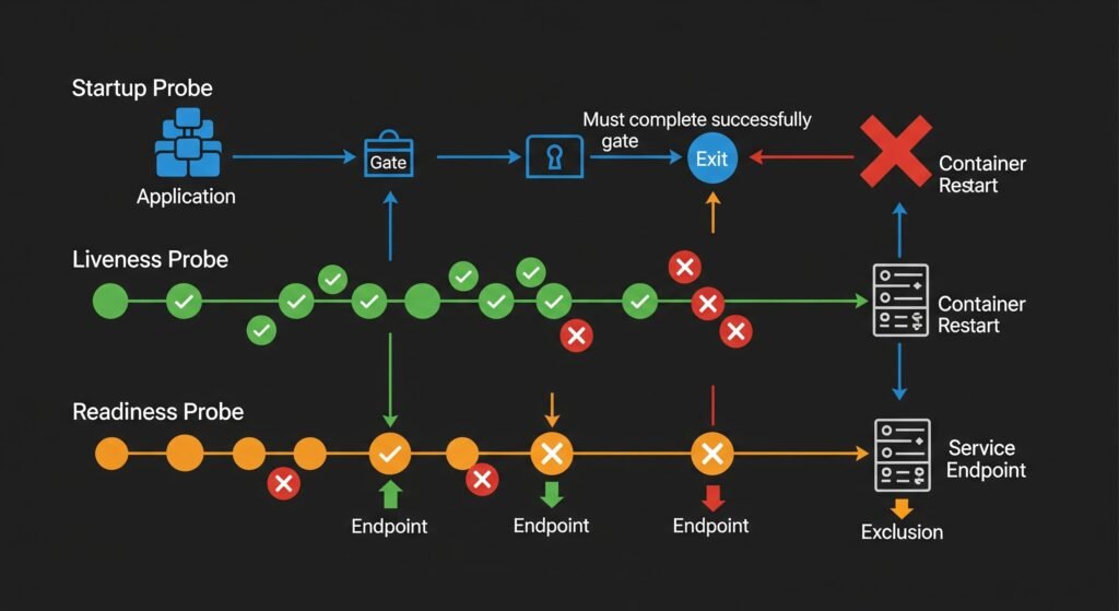 DIAGRAM: Three probe types side by side — Startup Probe (runs first, gate before liveness kicks in), Liveness Probe (runs continuously, kills and restarts on failure), Readiness Probe (runs continuously, removes from Service endpoints on failure but does not restart). Show timeline and what each probe controls.