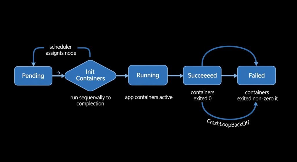 Every Pod moves through a defined sequence of phases from creation to termination. Understanding this sequence is essential for writing correct health checks and debugging startup failures.